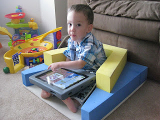 And these are Kian's newest therapy tools. He has soft braces on his legs to help stretch his muscles, and the v-chair helps him not tip over while he is absorbed in his apps.